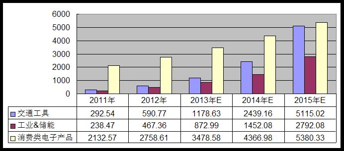 在這個市場,鋰離子電池需求的增長主要來自于兩方面:一是產(chǎn)品本身的智能升級對電池用量的需求在增長;二是新產(chǎn)品產(chǎn)生了新的市場需求。對于傳統(tǒng)功能手機,可能700mAh的電池就足夠了,但對于智能手機,2000mAh都顯得不夠。至于后者,突出的例子是平板電腦產(chǎn)品自2010年推出以來,到2012年迅速取得了1.3億臺的年銷量,為智能手機、平板電腦等充電的移動電源產(chǎn)品市場2012年極其火爆,銷量達(dá)到了驚人的100多萬kWh,是2011年的數(shù)倍。