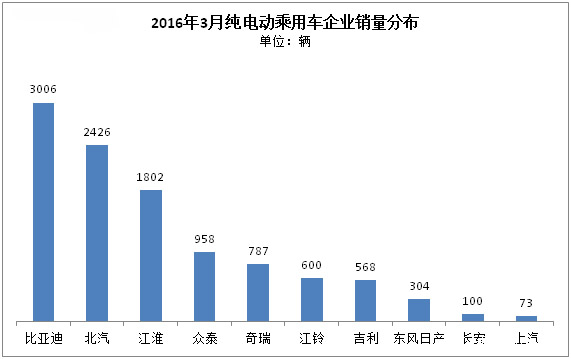 分車企看,10家純電動乘用車企業(yè)排行中,比亞迪以3006輛的水平居于首位,而北汽則由2月排名首位滑至本月第2名,而江淮繼續(xù)維持第三名的地位。值得指出的是,雖然排名有所改變,但總體看,細分到3月各家車企銷量都有不同程度的提升。其中,3月銷量過千輛的車企依舊是前三名,比亞迪、北汽、江淮三家企業(yè)累計銷量達7234輛,占純電動乘用車總銷量的69%。而銷量過百輛的企業(yè)也達9家,較之2月有大幅提升。