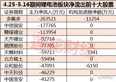 另據(jù)東方財富Choice數(shù)據(jù)統(tǒng)計發(fā)現(xiàn),近期(4.25-5.16)主力資金近期撤出了多只鋰電池概念牛股,多氟多、天齊鋰業(yè)、天賜材料都位居主力資金凈流出前列。
