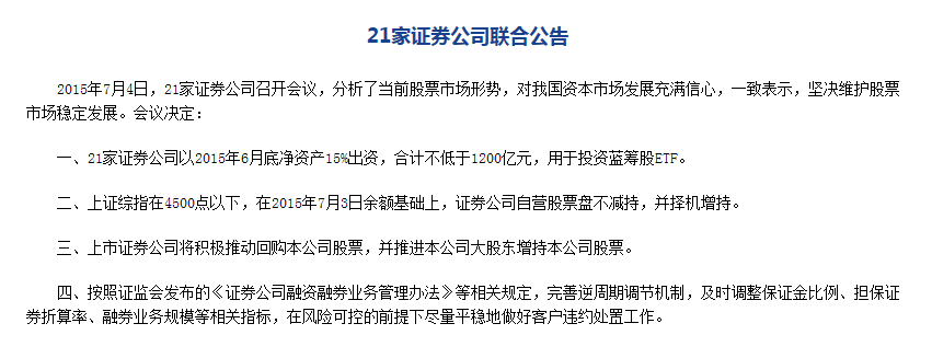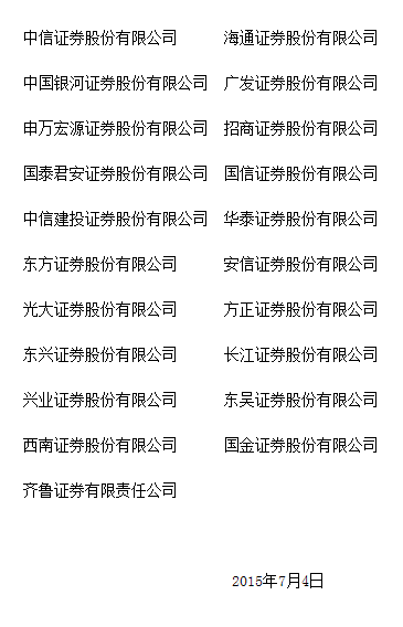 2015年7月4日,21家證券公司召開會(huì)議,分析了當(dāng)前股票市場(chǎng)形勢(shì),對(duì)我國(guó)資本市場(chǎng)發(fā)展充滿信心,一致表示,堅(jiān)決維護(hù)股票市場(chǎng)穩(wěn)定發(fā)展。會(huì)議決定如下。