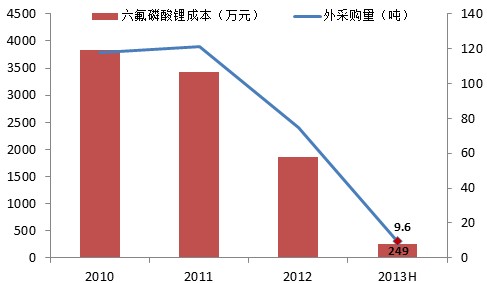 據大智慧通訊社統計發現,公司電解液生產中的六氟磷酸鋰成本在逐年下降,2013年上半年六氟磷酸鋰的成本僅249.0萬元,約為2011年全年成本的1/14,下降幅度明顯。