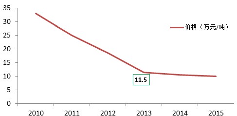 盡管天賜材料實現了六氟磷酸鋰的自給自足,但隨著國內企業在六氟磷酸鋰技術上的不斷突破,國產化率逐漸的提高,其價格也在逐漸的下滑,預計2013年價格11.5萬元/噸左右,較2011年下降了65.2%。