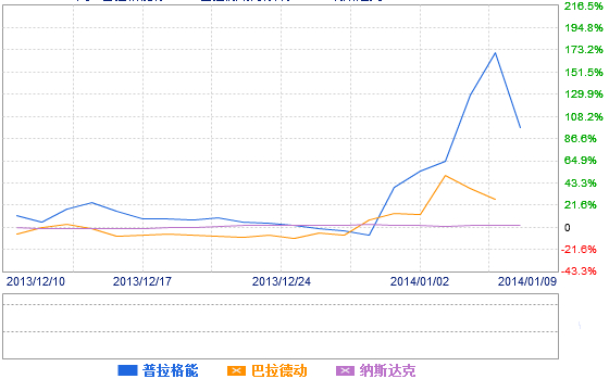 受上述利好消息的帶動,美股中燃料電池相關股票大漲。自12月底以來,在納斯達克指數并未出現大幅波動情況下,美股普拉格能源從12月31日的1.55美元/股,一路攀升至1月8日(周三)的高位4.52美元/股,累計漲幅191.61%;另一只在美國納斯達克上市的燃料電池股票巴拉德動力系統(NASDAQ:BLDP)也從12月31日1.52美元/股,累漲63.82%,至1月7日(周二)的2.49美元/股。