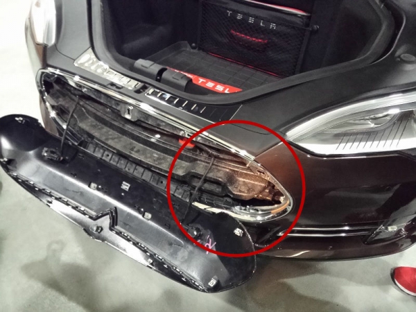 工作人員拆開(kāi)了車(chē)的前唇蓋,而拖車(chē)鉤就隱藏在其右側(cè)的空隙內(nèi)