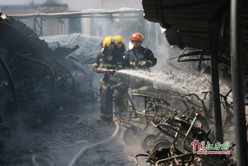 根據(jù)現(xiàn)場情況,消防官兵迅速鋪設(shè)水帶架設(shè)水槍,1小時后,大火徹底被撲滅,但現(xiàn)場的電動車已被燒毀了300余輛,只剩下骨架。
