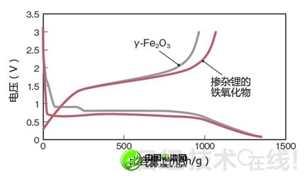 初始充放電的結果顯示,進行過水熱處理的鐵氧化物的初始放電容量升高,可比γ-Fe2O3降低不可逆容量。