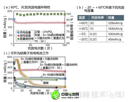 五鈴精工硝子開發出了經過150次循環充放電后實現99%的容量維持率的鋰離子充電電池(a)??稍冢?0~+60℃的大溫度范圍內使用(b)。特點是負極材料采用了Sn-Sb硫化物玻璃,還可用于鈉離子充電電池(c)。(圖由《日經電子》根據五鈴精工硝子的資料制作)