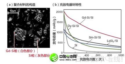 在稀土類金屬中,把采用釓(Gd)的復合材料Gd-Si/Si用作負極的電池,其容量和充放電循環特性尤其高。在基于杯形細胞(Beaker Cell)的試驗中,初始充放電容量創下了1870mAh/g的極高值。充放電1000次后也維持了690mAh/g的容量。該研發小組已經試制出以Gd-Si/Si為負極,以LiMn2O4為正極的電池。初始充放電容量為1230mAh/g,循環100次后為860mAh/g。