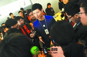 昨晚8時(shí)30分許,西單大悅城的蘋果專賣店里人頭攢動(dòng)。由于是周五晚上,顧客數(shù)量比平時(shí)多了不少。幾乎每臺(tái)展示產(chǎn)品前都站著人。