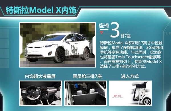 內飾部分,特斯拉Model X將采用17英寸中控觸摸屏,集成了多媒體系統、3G網絡和導航等多種功能。與此同時,儀表盤也將配備Tesla Touchscreen觸摸屏。而在座椅排列上,特斯拉Model X選擇了三排7座的排列方式,為了方便乘客進出,Model X的3排座椅均被設計為可前后移動。對此,特斯拉官方表示,即便第一排已經安裝了兒童安全座椅,與第二排之間也已預留好距離,使第二排可以向前一直滑動。第三排座椅則位于鷹翼后門位置,成人進入第三排如同進入前兩排一樣方便,且進出鷹翼門可實現直立行走穿越。