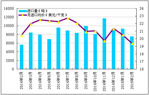 圖1 2014年2月-2015年2月多晶硅進(jìn)口量及進(jìn)口均價示意圖數(shù)據(jù)來源:海關(guān)