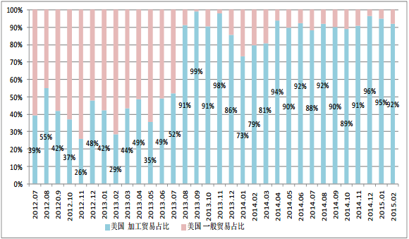 二、2月份自美國進(jìn)口多晶硅1456噸,環(huán)比減少13.5%,但其中按照加工貿(mào)易方式進(jìn)口量達(dá)1341噸,占當(dāng)月從美國進(jìn)口總量的92.1%,依然是加工貿(mào)易占絕對主導(dǎo)地位。自美國按加工貿(mào)易方式進(jìn)口占絕對主導(dǎo)地位的現(xiàn)象始于2013年7月“雙反”立案后的8月份,之后加工貿(mào)易規(guī)避“雙反”的策略一直屢試不爽,從不間斷,因此從美國加工貿(mào)易進(jìn)口一直占絕對主導(dǎo)地位是導(dǎo)致總進(jìn)口量難以回歸合理范圍的另一重要因素。