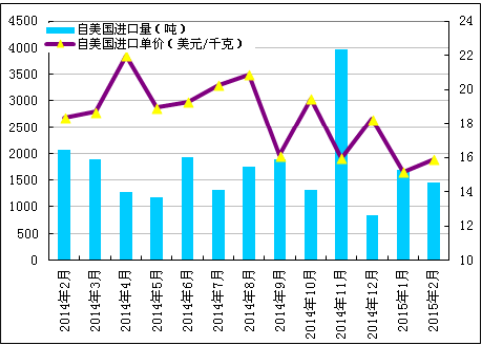 2015年2月份從美國(guó)進(jìn)口多晶硅量減少至1456噸,環(huán)比降幅為13.5%;2月份進(jìn)口單價(jià)微幅上調(diào)至15.90美元/千克,環(huán)比漲幅為5.0%。