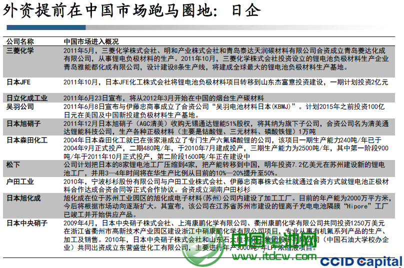 2011年5月,三菱化學株式會社、明和產(chǎn)業(yè)株式會社和青島泰達天潤碳材料有限公司合資成立青島菱達化成有限公司,從事鋰電負極材料的生產(chǎn)。2011年10月,三菱化學株式會社投資設立的鋰電池負極材料生產(chǎn)企業(yè)青島雅能都化成有限公司,設計建設8條生產(chǎn)線,將建成全球最大的鋰電池負極材料生產(chǎn)基地。