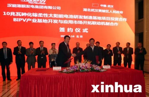 新華網北京4月18日電(記者方政軍 徐海波)4月16日,北京——漢能薄膜發電集團有限公司(00566.HK,下稱“漢能薄膜發電”)與武漢市黃陂區政府在首都簽訂投資合作協議,漢能薄膜發電將在黃陂臨空產業園投資建設10兆瓦砷化鎵(GaAs)薄膜太陽能電池研發制造基地,該項目將成為全世界產量最大的砷化鎵太陽能電池生產基地,其中一期建設規模3兆瓦,并為實施項目設立項目公司。