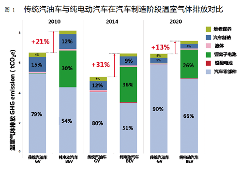 汽車制造階段包括原材料獲取、材料及零部件加工制造、電池的生產、整車裝配、維修保養、汽車生命周期末端的報廢與回收處理等階段。汽車材料組成數據采用GREET2 2016中乘用車平均水平數據,并用輕量化代表2020年汽車制造階段技術的進步;原材料、能源和生產過程的數據采用分別選取2010年和2014年CALCD中的生命周期溫室氣體排放數據。研究表明,與傳統汽油車相比,純電動汽車制造階段溫室氣體排放的增幅從2010年的21%,增加到2014年的31%,預計到2020年會下降到13%(見圖1)。