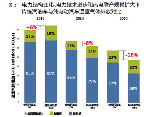 在2010年的電力結構、發電技術水平下和熱電聯產規模下,與傳統汽油車相比,純電動汽車并不具備全生命周期溫室氣體減排優勢。隨著我國對電力結構的調整、發電技術的進步,以及熱電聯產技術的大規模推廣,2010年到2020年之間,純電動汽車全生命周期的溫室氣體減排潛力逐漸釋放,并在2014年達到8%;預計到2020年,純電動汽車相比傳統汽油車全生命周期的溫室氣體減排潛力將達到18%。