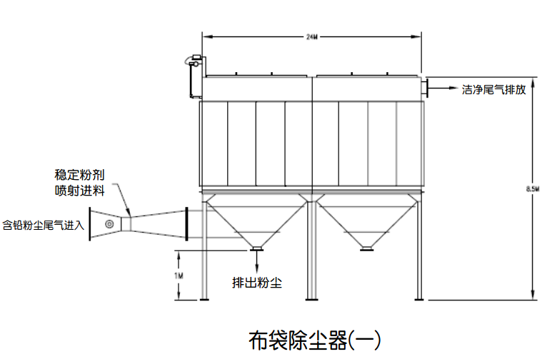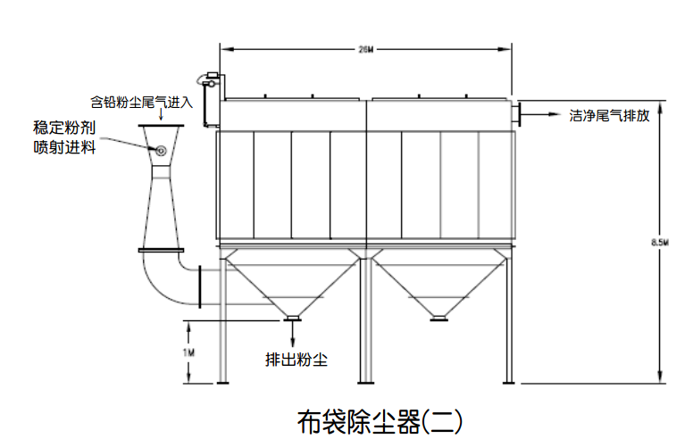 *如果冶煉廠排出粉塵顆粒有部份大于5微米,建議于布袋除塵器前加裝一旋風除塵器。