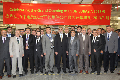 CSUN土耳其工廠總體規劃產能包括300MW組件和300MW電池。該工廠的落成投產對于CSUN加快生產制造的全球布局,積極應對歐美雙反具有重要的戰略意義。在慶典儀式上,CSUN還與項目開發商Sybac公司簽署100MW組件供應的框架協議,與土耳其TUV公司簽署合作協議。土耳其本地銀行AKBANK和ISBANK官方承諾將為CSUN在土耳其和歐洲市場的業務給予支持。