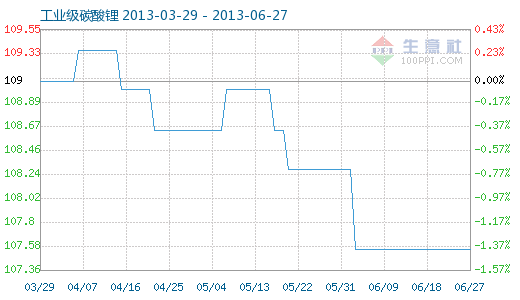 6月27日工業(yè)級碳酸鋰商品指數(shù)為107.55,與昨日持平,較周期內(nèi)最高點112.10點(2012-11-04)下降了4.06%,較2012年01月05日最低點98.94點上漲了8.70%。(注:周期指2011-09-01至今) 工業(yè)級碳酸鋰商品指數(shù)自
