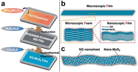 圖1.(a)NG-MoS2復(fù)合材料的制備示意圖,(b)NG-MoS2的“薄膜-泡沫-薄膜”分級(jí)結(jié)構(gòu)示意圖,以及(c)NG納米片雙面負(fù)載納米MoS2的三明治結(jié)構(gòu)示意圖。