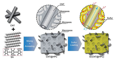 圖3. 多壁碳納米管(CNT)內(nèi)嵌到HPC中形成導(dǎo)電網(wǎng)絡(luò),將硫引入制備出硫-碳復(fù)合正極材料S/(CNT@HPC)傳輸通道。