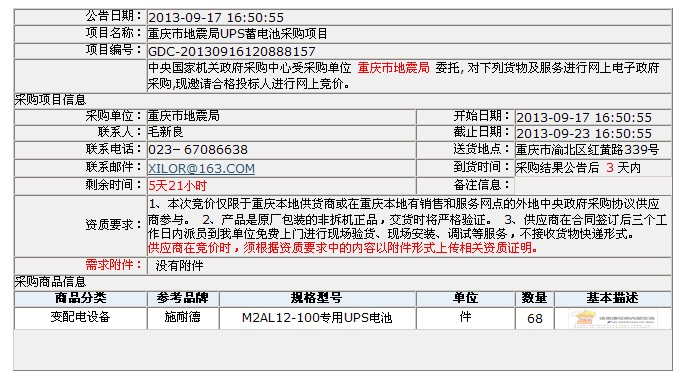 招標編號:GDC-20130916120888157 招標代理:中央國家機關政府采購中心 業主單位:重慶市地震局 報名截止:2013-09-23 所屬地區:重慶 所屬行業:電子電器