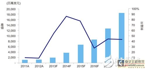 圖1 2011~2018年全球穿戴式設(shè)備產(chǎn)值分析 資料來源:拓墣(08/2013)