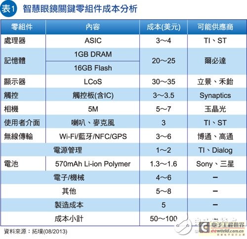 針對各項(xiàng)智能眼鏡關(guān)鍵零組件成本落點(diǎn)(表1),據(jù)分析,整合近距離無線通信(NFC)、藍(lán)牙(Bluetooth)、無線區(qū)域網(wǎng)絡(luò)(Wi-Fi)和調(diào)頻(FM)的四合一無線傳輸模塊,可望以3-6美元的價(jià)格及低占位體積優(yōu)勢獲得原始設(shè)備制造廠(OEM)青睞;至于處理器部分,廠商將傾向采用專用集成電路(ASIC),可能供應(yīng)商為德州儀器(TI)及意法半導(dǎo)體(ST),每顆芯片成本約3-4美元;此外,廠商將采用同樣具低成本優(yōu)勢的硅基液晶 (LCoS)方案做為顯示面板,成本約30~35美元,可能供應(yīng)商為臺商立景及禾鈶。總體而言,若供應(yīng)鏈廠商可控制各項(xiàng)零組件成本于理想價(jià)格區(qū)間,則智能眼鏡成本將僅50~100美元,仍可為品牌廠帶來可觀獲利。