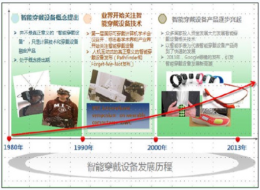 智能穿戴設備是指將智能化的設計融入到可穿戴式技術中,開發出可以進行全新的科技交互模式、并可穿戴的智能型設備,如頭盔、眼鏡、手表、手環及服飾等。早在八十年代,業界就提出了智能穿戴設備的概念,但產品只是將計算機技術與穿戴設備的簡單融合,并不能算是真正意義上的產品。1997年,由麻省理工學院、卡耐基梅隆大學、佐治亞理工學院聯合舉辦了第一屆國際可穿戴計算機學術會議,標志著業界開始高度關注智能穿戴設備技術,這極大地推動了軟硬件技術的發展。此后,基于新興技術研發的智能穿戴設備產品開始逐步進入市場。進入二十一世紀,一大批IT業界的巨頭公司更廣泛地涉足該領域,產品類型逐步豐富,產品數量逐步增多,尤其是谷歌推出“Google glass”,更是掀起了智能穿戴設備的熱潮。
