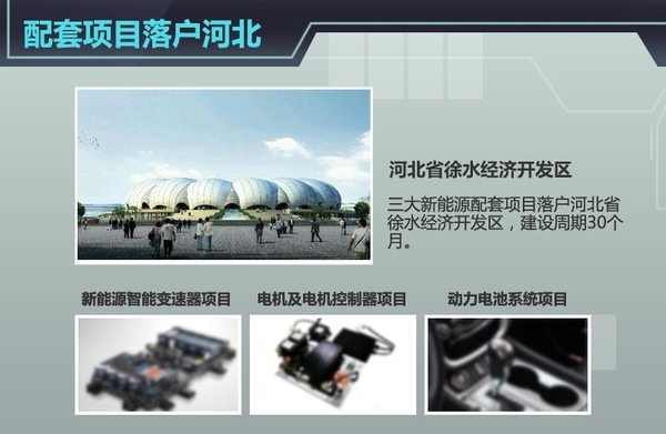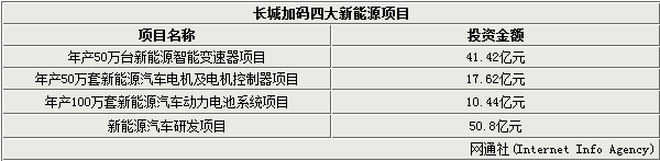 長城汽車除了強化新能源研發項目,新能源車的相關產業配套項目也已有所布局。“年產50萬臺新能源智能變速器項目”總投資41.42億元,主演開展新能源智能變速器的研發、試驗和生產;“年產50萬套新能源汽車電機及電機控制器項目”總投資額17.62億元;“年產100萬套新能源汽車動力電池系統項目”總投資額為10.44億元。該項目產品涵蓋PHEV、EV、輕混、強混等四個子項目的配套動力電池系統(包括鋰離子動力電池組件和電池管理系統)。這三個項目建設周期均為30個月,地點位于河北省徐水經濟開發區。