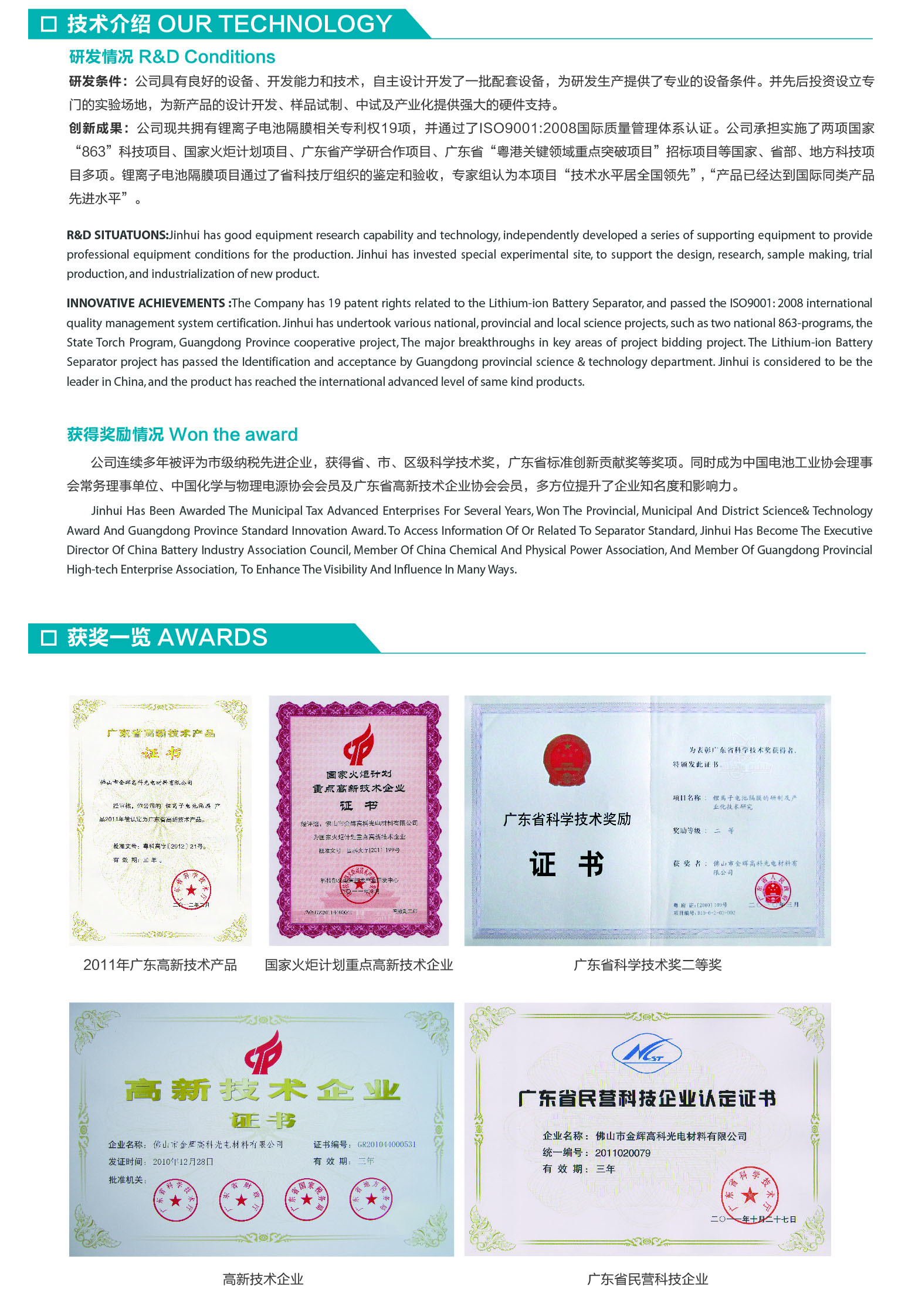 佛山市金輝高科光電材料有限公司(簡稱金輝公司)成立于2006年,目前注冊資本為921萬美元,是國內(nèi)第一家使用濕法工藝生產(chǎn)鋰離子電池隔膜的廠家,國家火炬計劃重點(diǎn)高新技術(shù)企業(yè),廣東省創(chuàng)新型企業(yè)試點(diǎn)單位。我司研制生產(chǎn)的鋰離子電池隔膜以質(zhì)量穩(wěn)定、性價比高等優(yōu)勢蜚聲國內(nèi)外市場,打破了長久以來國外產(chǎn)品的壟斷,填補(bǔ)了國內(nèi)空白,工藝技術(shù)居國內(nèi)領(lǐng)先地位,產(chǎn)品質(zhì)量達(dá)到國際同類產(chǎn)品先進(jìn)水平。