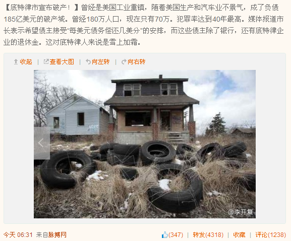 曾經(jīng)是美國(guó)工業(yè)重鎮(zhèn),隨著美國(guó)生產(chǎn)和汽車業(yè)不景氣,成了負(fù)債185億美元的破產(chǎn)城。曾經(jīng)180萬(wàn)人口,現(xiàn)在只有70萬(wàn)。犯罪率達(dá)到40年來(lái)最高。媒體報(bào)道,市長(zhǎng)表示希望債主接受“每美元債務(wù)償還幾美分”的安排,而這些債主除了銀行,還有底特律企業(yè)的退休金。這對(duì)底特律人來(lái)說(shuō)是雪上加霜。
