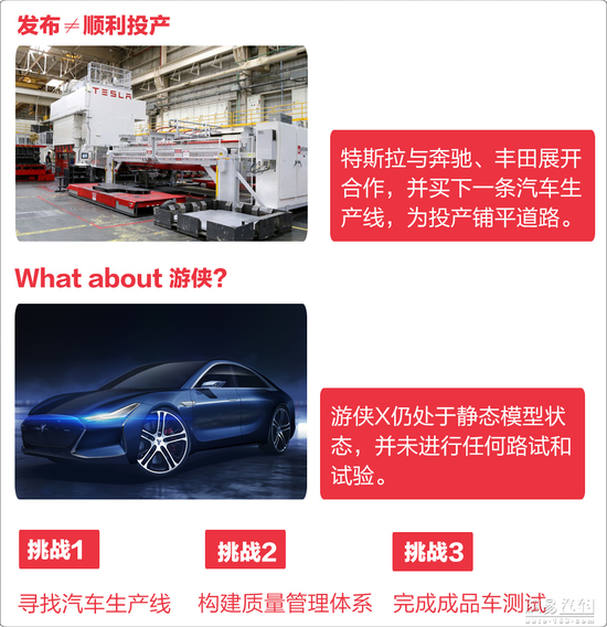 特斯拉找到了奔馳、豐田這兩個傳統汽車廠商進行合作,收購了一條GM現成汽車生產線,實現自己生產。在零部件開發、生產線運轉方面獲得了幫助,而傳統汽車廠商為此換來了特斯拉的電動技術,加持至整個品牌的技術儲備中去。游俠X會選擇代工生產,還是收購一個完整的生產線,這一切關于投產的信息,游俠在此次發布會中并未公示。