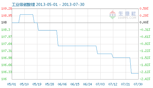 7月30日工業級碳酸鋰商品指數為106.28,與昨日持平,較周期內最高點112.10點(2012-11-04)下降了5.19%,較2012年01月05日最低點98.94點上漲了7.42%。(注:周期指2011-09-01至今)
