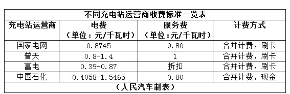 不同充電站運營商收費標準一覽表