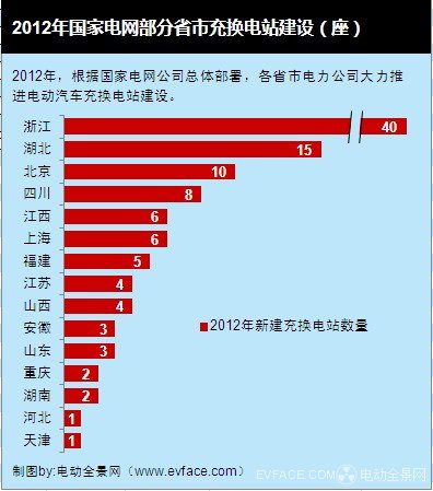 2012年,國家電網下屬各省市電力公司建設電動汽車充換電站,其中浙江建設力度最大,共建成40座換電站,包括杭州市建設24座和金華市8座,其次是湖北和北京,分別建設了15座和10座充換電站