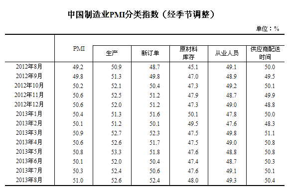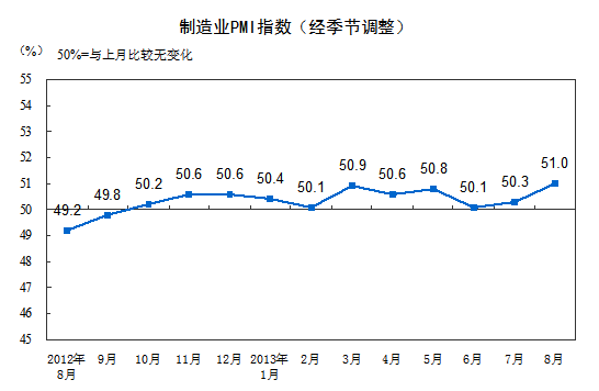 2013年8月,中國制造業采購經理指數(PMI)為51.0%,比上月上升0.7個百分點,連續11個月位于臨界點以上。