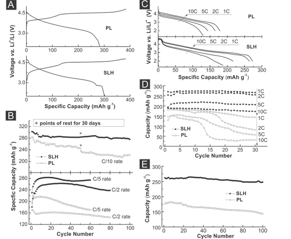 SLH的40C倍率數據還要好于PL的20C數據,這還讓富鋰混不?40C是什么概念?相當于1分半中就能有100mAh/g的比容量,這個誠意滿滿的是奔著電動車的終極方案——集動力與高比能為一體而去的,只不過嘿嘿,他們沒給充電曲線。而且他們放電到了1V,電化學的勢窗過大,這個是比較危險的,鑒于只是半電池的實驗,也就無所謂了。