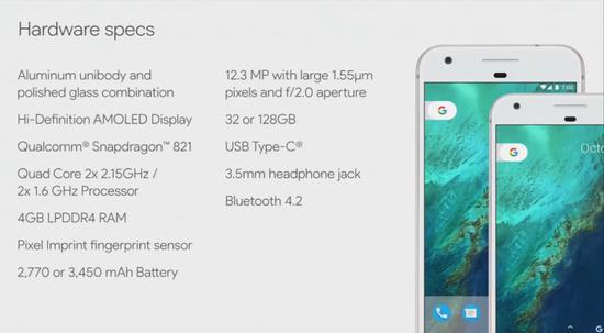5英寸的Pixel和5.5英寸的Pixel XL擁有完全相同的基礎(chǔ)硬件配置,包括驍龍821處理器,4GB的RAM+32/128GB的ROM,并支持內(nèi)存卡擴(kuò)展。后置1200萬像素、f/2.0鏡頭,支持光學(xué)防抖,前置800萬像素鏡頭。配備USB-C接口、指紋識(shí)別模塊以及3.5毫米的耳機(jī)接口。