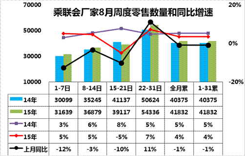 15年8月的狹義乘用車廠家的出貨速度相對較異常,第1-3周的銷量相對偏弱,最后一周的銷量拉升較強,車市8月末的假期的異常走勢也是少有的。