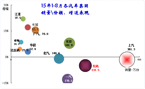 15年1-8月的大集團走勢分化嚴重,一汽和東風嚴重的負增長,而長安和廣汽表現較好。中小集團中只有華晨表現稍差。一汽和東風等大集團因為商用車的比重較大,經濟下滑影響卡車表現,因此表現稍差可以理解。