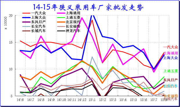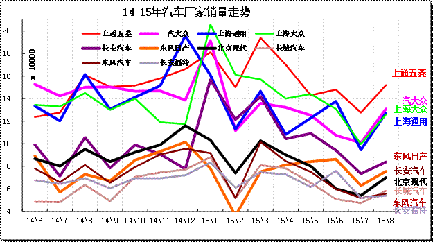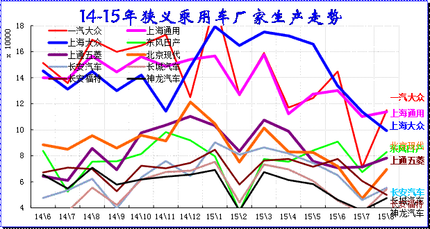 15年8月的廠家產銷競爭仍是較激烈的,走勢差異性大,主力廠家全面回調。三強的主力廠家的一汽大眾和上海通用的產量調整較大;日系的生產增量較強,形成強力增產增庫存的現象。