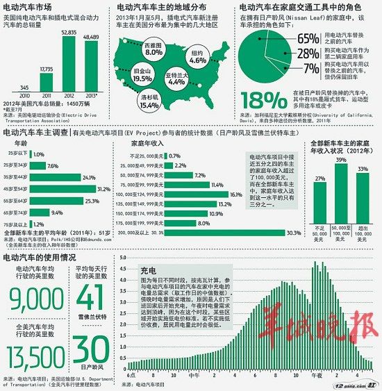 電動汽車項目的數據還顯示,相較于一般的汽車車主,插電式汽車的車主相對更加富有。這反映了電動汽車的售價:通用汽車公司的油電混合動力汽車雪佛蘭伏特的售價約為40000美元(約合人民幣244800元),純電動汽車日產聆風的售價約為30000美元(約合人民幣183600元)。電動汽車的車主還相對更加環保—電動汽車車主中有很多人都安裝了車載太陽能板。