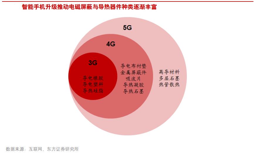 5G智能手機傳輸速率、頻率、信號強度等顯著提升,從核心芯片到射頻器件、從機身材質到內部結構,零部件將迎來新的變革,對電磁屏蔽和導熱提出更高要求,未來電磁屏蔽與導熱產品有望進一步呈現多元化、工藝升級、單機用量提升等趨勢,具備更廣闊的的成長空間。