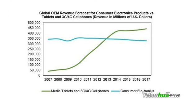 從IHS的數(shù)據(jù)來(lái)看,2013年智能手機(jī)和平板電腦的銷售額將超過(guò)電視機(jī)、音響、照相機(jī)、游戲主機(jī)和家用電器等電子產(chǎn)品的總和。數(shù)據(jù)顯示,智能手機(jī)和平板電腦的銷售額將達(dá)到3543億美元,而剩余消費(fèi)電子產(chǎn)品的銷售額為3444億美元,前者比后者高出3%左右。
