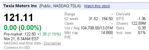 自10月1日以來,特斯拉股價縮水約37%,周三納斯達克股市,特斯拉股價下跌3.9%,收于121.11美元。周四盤前,截至美東時間11月21日早8:34(北京時間11月21日晚21:34),特斯拉股價上揚1.39美元,漲幅為1.15%,暫報122.50美元。