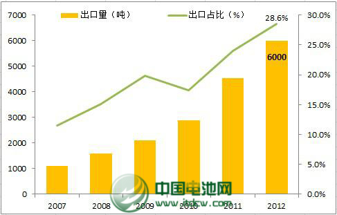 (附圖一為2007-2012年中國鈷酸鋰年出口量情況 數(shù)據(jù)來源:中國海關(guān)數(shù)據(jù))