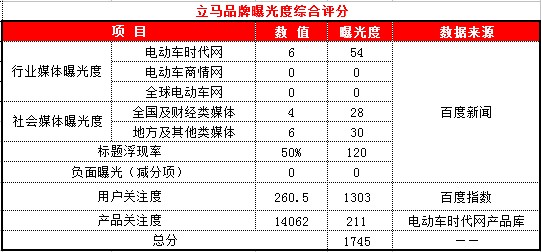 立馬電動車在上期榜單中暫時滑出,但是11月重新殺回榜單, 并成功躋身第九的位置,綜合表現非常穩健。但是從近幾期榜單的表現來看,立馬電動車在網絡平臺的主動新聞宣傳較少,因而在媒體曝光度上表現平平,不論品牌還是產品,都沒有在網絡媒介上過多表現,可喜的是同樣沒有負面消息來拉低總分。