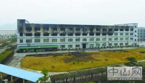 記者看到,起火的是靠近工廠大門的一棟四層樓高倉庫,其中單面外墻均設有30多個窗口的第三、四層樓已被燒通。記者觀察到,雖然離事發時間將近12小時了,但起火倉庫里被燒焦的物品仍然冒出煙霧。